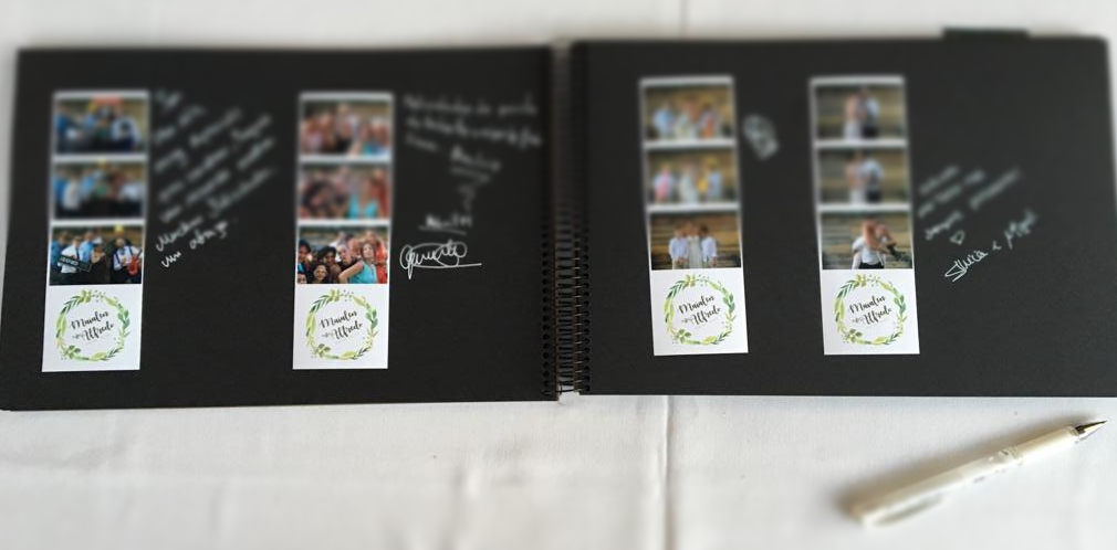 El álbum de fotos con las dedicatorias de vuestros invitados. Tiene en la portada vuestro logotipo personalizado, las hojas son cartulina negra y el bolígrafo es blanco para que resalte la dedicatoria. Imprimen dos copias de cada foto, entonces nosotros pegamos uno en el álbum y los invitados escriben una dedicatoria. Siempre hay alguno de nosotros controlando que estén bien colocados y con la dedicatoria. Es un recuerdo muy bonito y diferente, ya que al final del evento se lo entregamos a los novios. Siempre esperamos hasta que lo hayan dejado a buen recaudo (en un lugar seguro). En cuanto a la portada del álbum tenemos diferentes colores para ofrecer. Nuestro álbum es color marrón vintage, es el que está incluido en el precio. En el caso de que vuestro logotipo sea de colores y no queráis el color marrón os podemos ofrecer diferentes modelos de portadas. Tenemos color blanco roto, un beige, un blanco mate, blanco brillante... Nosotros traemos una mesa con un mantel blanco y una lámpara, en el caso de ser de noche, no hay problema, se ve perfectamente.